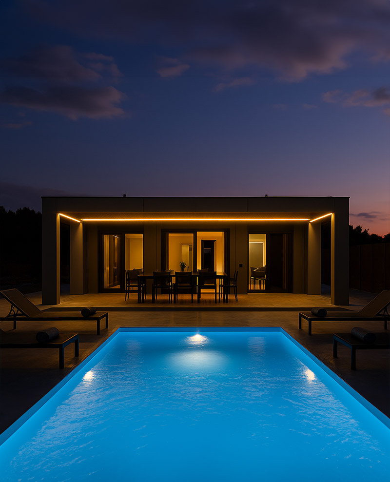 - Ιδιωτική πισίνα με ξαπλώστρες και lounge area.